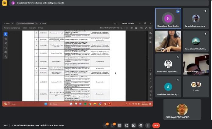 La segunda sesión se realizó de manera virtual y en ella participaron: el subsecretario de Gobierno, Martín Arango García; la coordinadora del Comité Estatal de Supervisión de Establecimientos Residenciales Especializados en la Atención de Adicciones, Guadalupe Berenice Suárez Ortiz